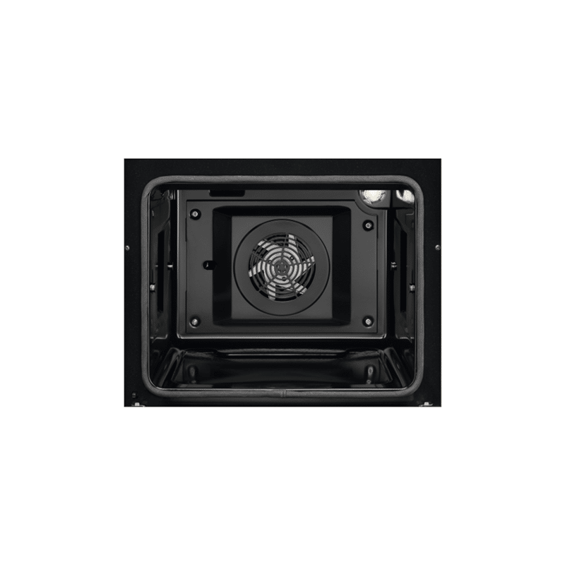 Vnútro rúry AEG s ventilátorom uprostred a osvetlením pre rovnomerné pečenie.