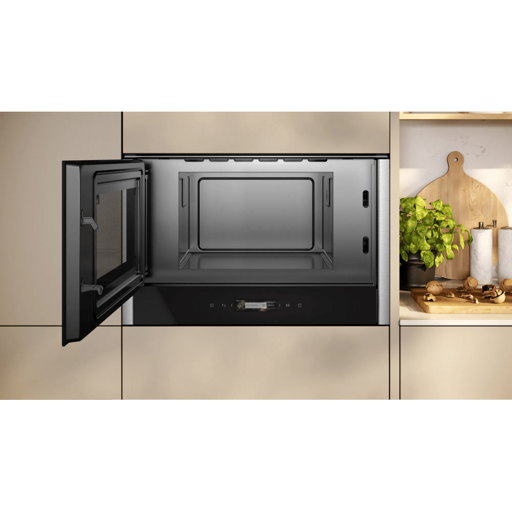 Vstavaná mikrovlnná rúra pre moderné kuchyne zo série N 70 ponúka praktické riešenie na rýchly ohrev a šetrné rozmrazovanie. Elegantná kombinácia čierneho skla a nerezu pôsobí čisto v každej linke a kompaktný objem 21 litrov je ideálny na každodenné používanie bez zbytočných kompromisov.